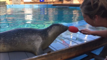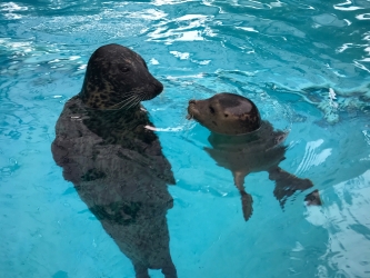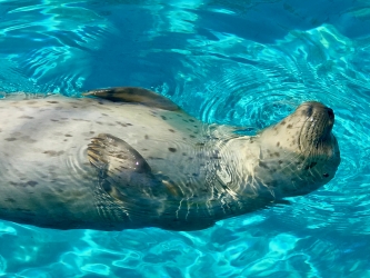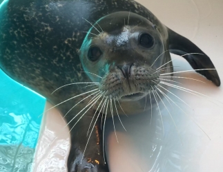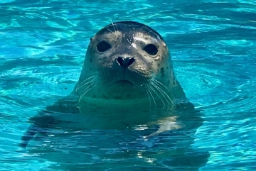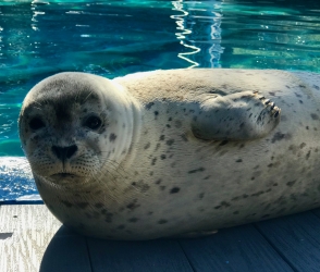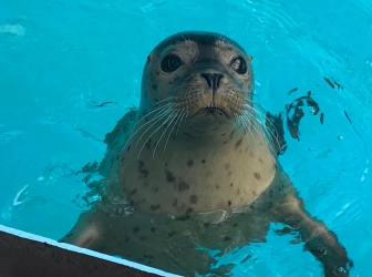 Meet Cocoa! Born to Mango on June 10, 2018, Cocoa was the first seal pup to ever be born at our Hersheypark location in Pennsylvania. She was born in the early morning hours and was swimming almost immediately after birth. She spent her first few weeks bonding with her mother and achieving important milestones including nursing, diving, and swimming efficiently! Harbor seal pups only nurse for 3-5 weeks. Thanks to the very fatty milk which mothers produce, pups grow very quickly almost tripling their birth weight in a month. In the wild, mother harbor seals leave their pups after the first few weeks to fend for themselves and learn to eat fish. That extra fat on the pups has them well prepared for the challenges they will face. In human care, life is kinder. We separated Cocoa from her mother at 4 weeks of age and began introducing her to fish (both live and dead). Initially she played with them. We patiently waited for instinct to kick in as the drive to catch and eat them developed. At approximately 6 weeks of age, this behavior happened in Cocoa and after she started consistently eating fish we began her training.